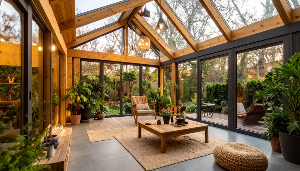 Fabriqué en aluminium thermolaqué ou en version mixte bois/alu, le jardin d’hiver est à la fois esthétique, résistant et isolant. Les vitrages peuvent être clairs, opales ou à contrôle solaire selon l’exposition. Des stores ou rideaux peuvent être intégrés pour plus de confort.